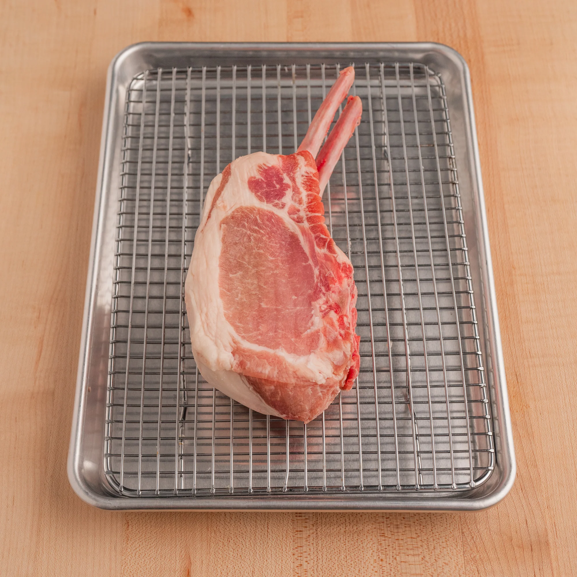 When it comes to pork chops, bigger is better. The SRF American Kurobuta double bone pork chop is cut thick to include two bones from a rack of pork. The result is a pork chop large in size and huge in flavor. The double bone pork chop is a beautiful entrƩe pan seared or stuffed and baked. These unique chops are 100% Kurobuta, also known as Berkshire, with a rich crimson color, fine marbling, and full of juicy flavor.